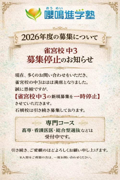 雀宮校の2026年度 中学3年生の新規募集を